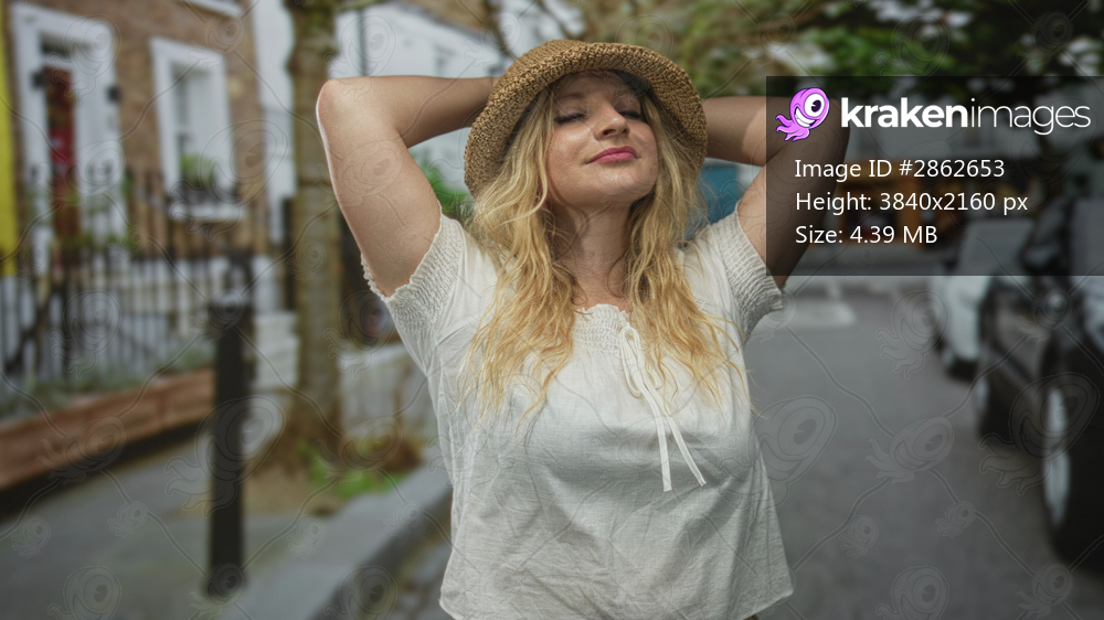 Woman in straw hat raising arms and tilting head back on a city street wearing white blouse; joyful.