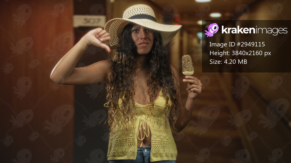 Woman in straw sun hat points finger while holding a chocolate coated ice cream bar with sprinkles in a hotel building hallway, wearing crochet top and jeans; playful summer. - Kraken Images