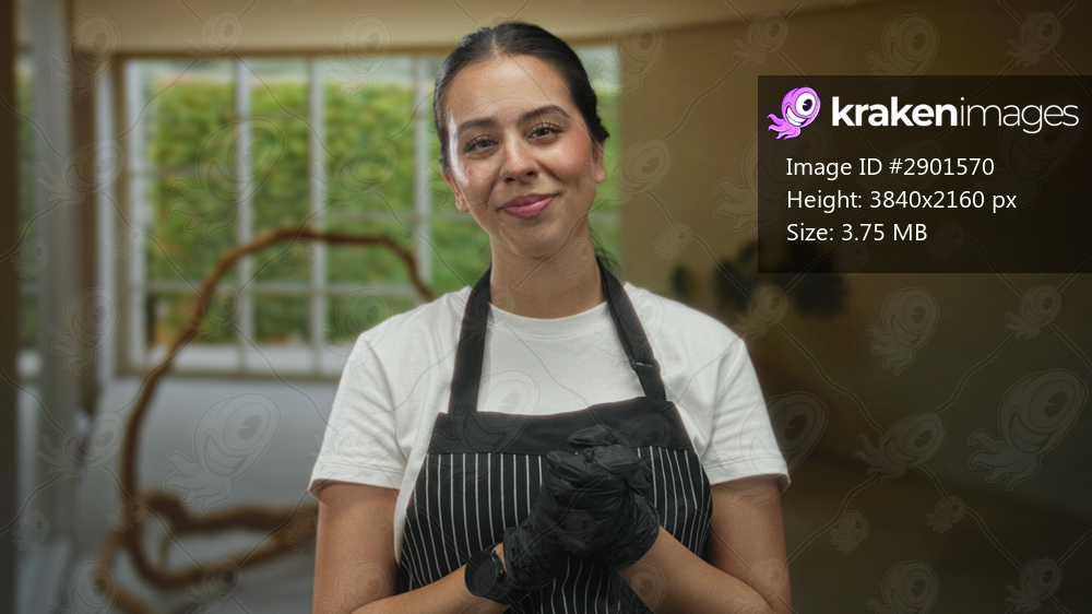 Woman in striped apron and black gloves smiling with gloved hand on neck in studio windowed room with sculpture and plant; serenity hospitality.