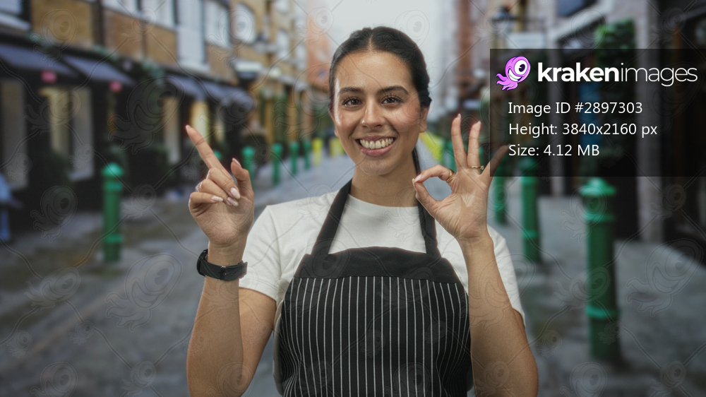 Woman in striped apron making ok sign and pointing index finger toward camera on a cobbled street with green bollards and shopfronts; friendly welcome. - Kraken Images
