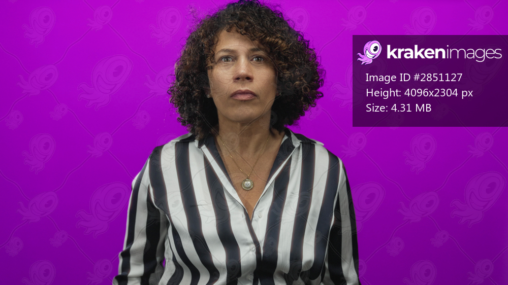 Woman in striped blouse with gold necklace raises hand toward camera against purple studio; surprise.
