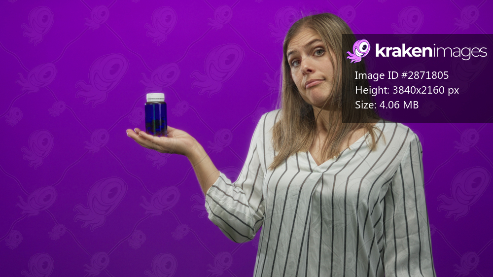 Woman in striped blouse holds a small blue bottle on open palm in studio under purple lighting; skepticism.