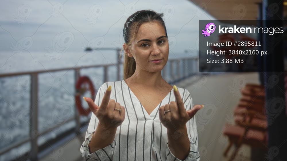 Woman in striped blouse on cruise ship deck beckons with both hands near chest by lifering and railing over ocean; inviting escape.