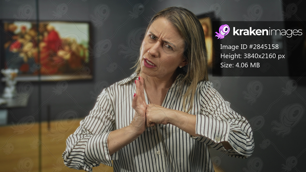 Woman in striped blouse raises her palm forward in a stop gesture and clenches her fist in building foyer; defiance.