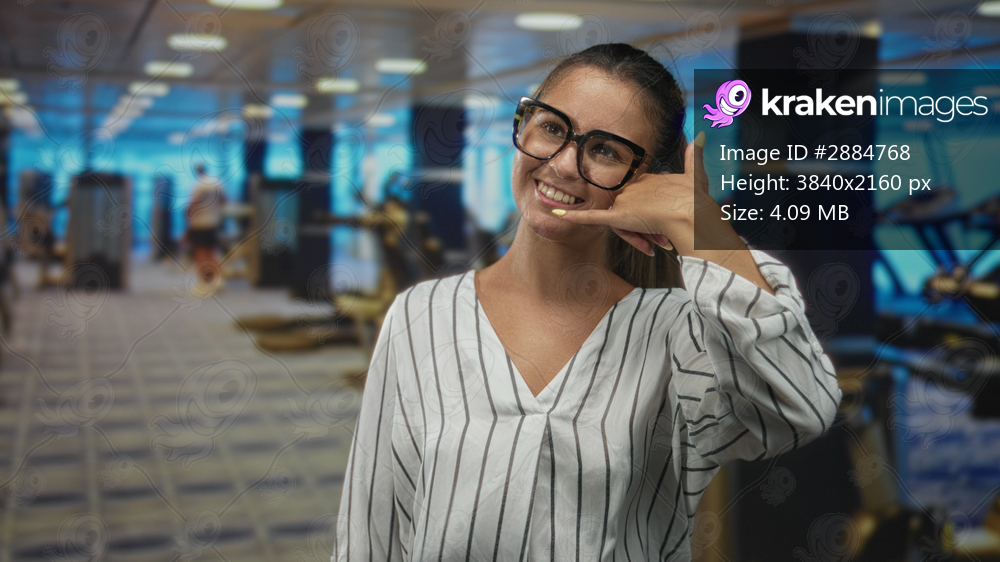 Woman in striped blouse wearing large glasses making a phone call hand gesture and smiling in gymnasium among exercise machines; playful confidence.