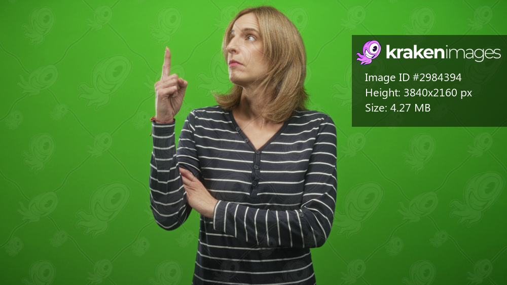 Woman in striped long sleeve top points index finger upward with crossed arm against a green screen in studio; stern warning.