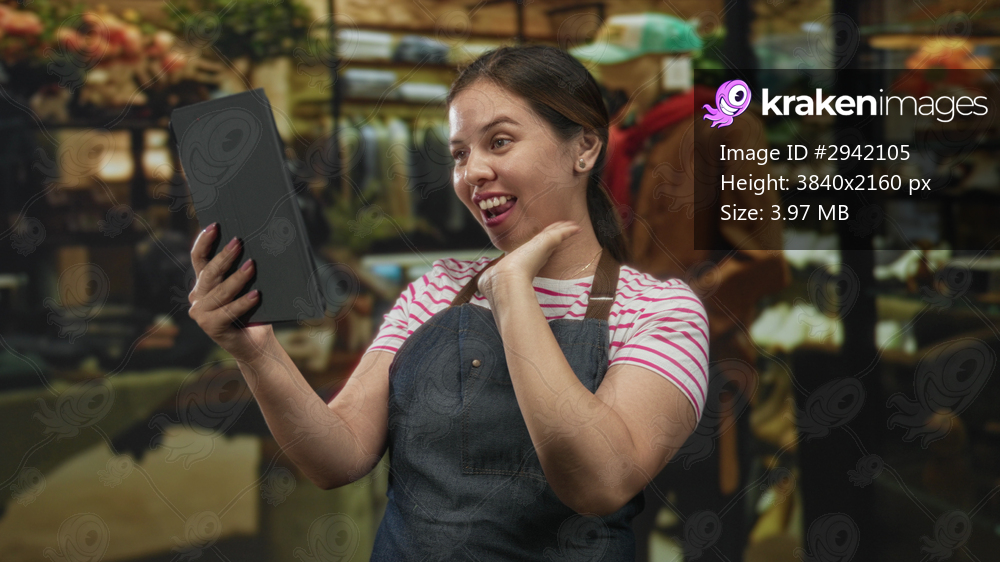 Woman in striped shirt and apron holding a tablet blows a kiss toward the screen while smiling inside a building shop; cheerful customer connection.