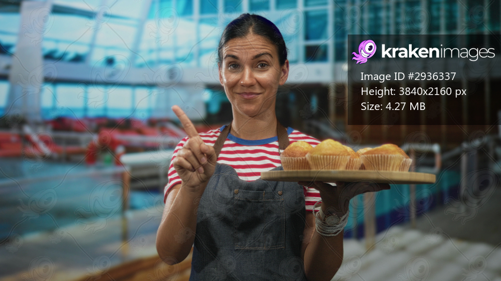 Woman in striped shirt and apron holding wooden tray of muffins points finger to self in building atrium; playful caution.