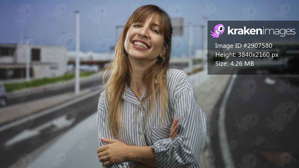 Woman in striped shirt with arms crossed and smiling on a highway curb near road markings and low buildings; confidence.