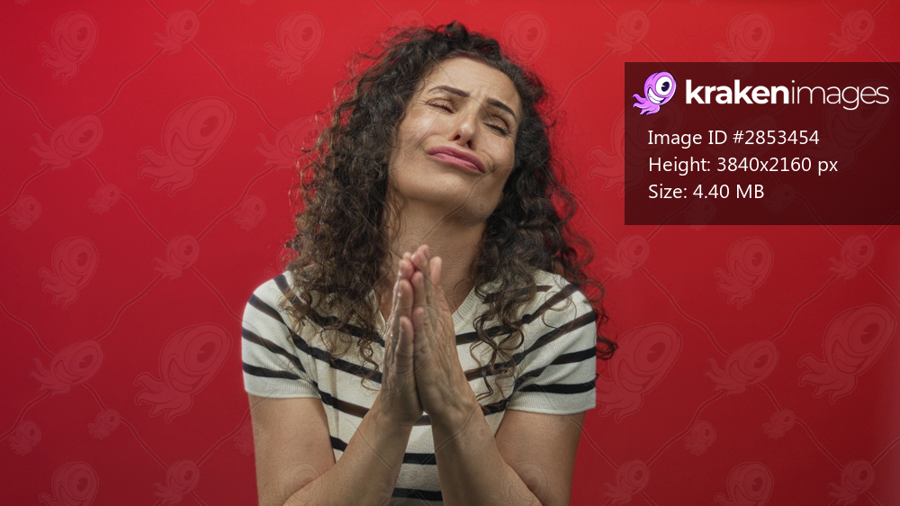 Woman in striped shirt beckoning open palms forward in bright red studio setting; financial desperation.