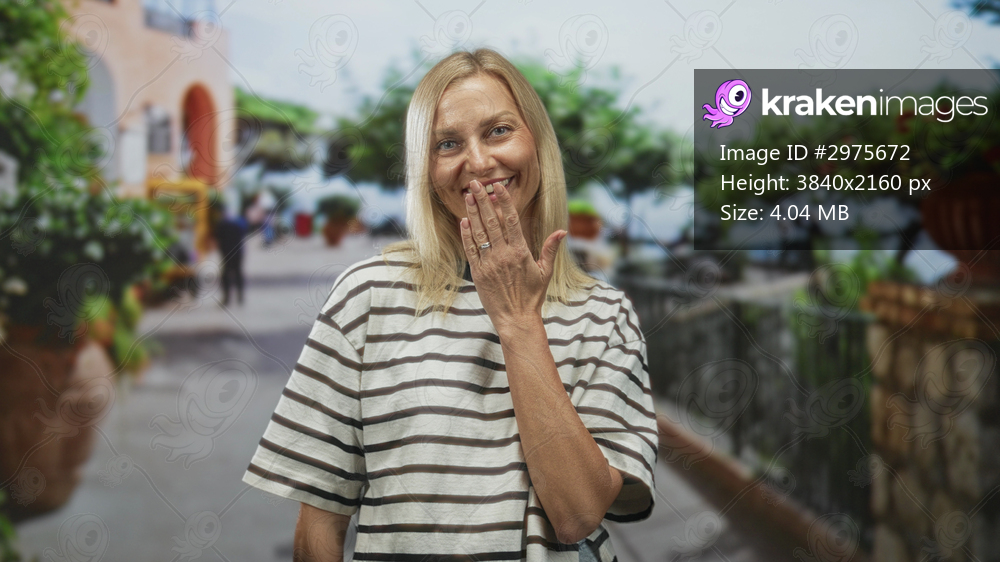 Woman in striped shirt blows a kiss with hand to mouth on a stone waterfront street lined with large planters, trees and a metal railing; joy.