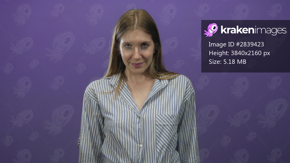 Woman in striped shirt with clenched fists and bright smile in purple studio setting capturing a moment of victory; joy.