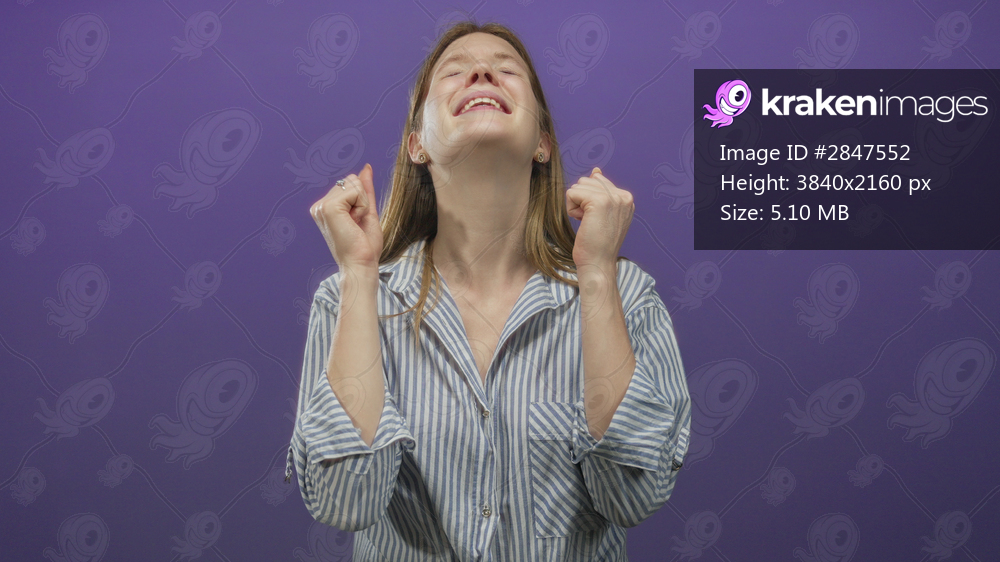 Woman in striped shirt with clenched fists and bright smile in purple studio setting capturing a moment of victory; joy.