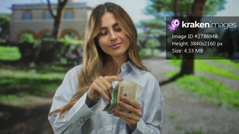 Woman in striped shirt counting banknotes with hands in a sunlit park; wealth planning satisfaction success.