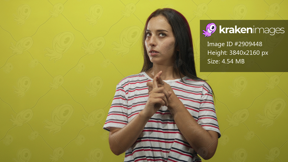 Woman in striped shirt counting on fingers and tapping thumb in studio with bright yellow backdrop; doubt hesitation decision.