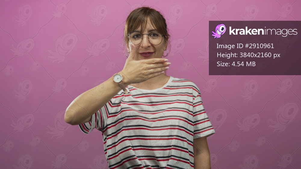Woman in striped shirt covering her eyes with hand and raised arm in pink studio with glasses and watch; playful secrecy coyness.