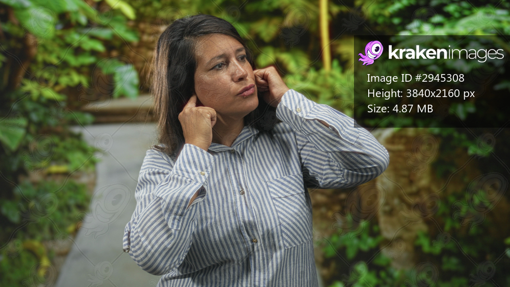 Woman in striped shirt covers ears with fingers on a forest walkway, with pained expression, tilted head and turned gaze; annoyance contemplation.