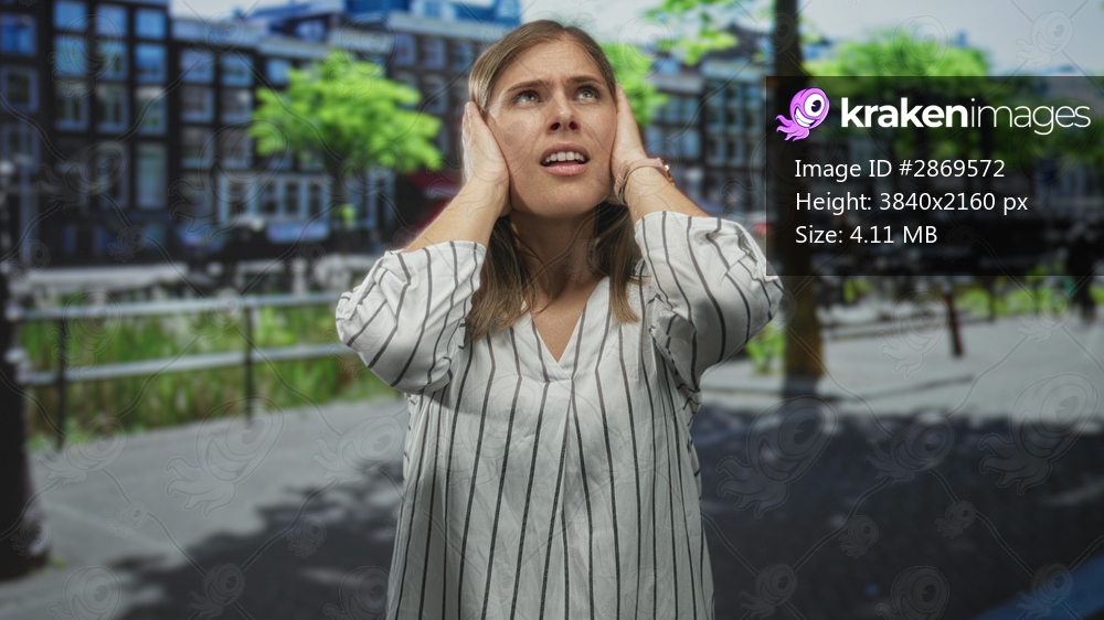 Woman in striped shirt covers ears on busy street beside canal railings under bright sunny sky; annoyance.