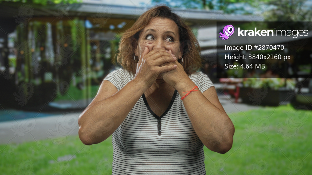 Woman in striped shirt covers mouth with hands in front of building outdoors on street; surprise reaction.