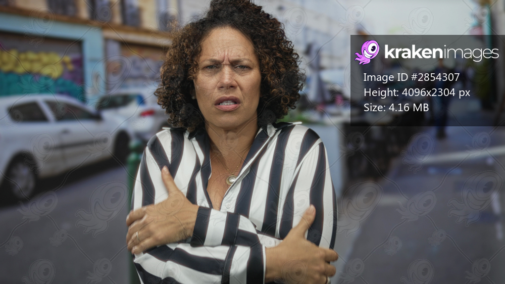 Woman in striped shirt crosses arms on street among parked cars and sidewalk cafe tables; discomfort.