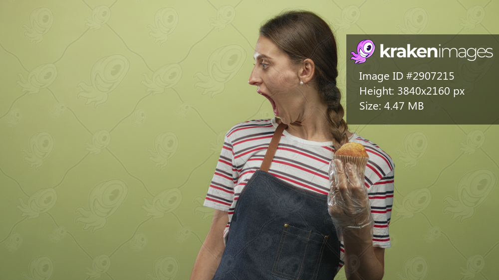 Woman in striped shirt and denim apron holding a muffin with gloved hand in studio with light green backdrop; surprise curiosity.