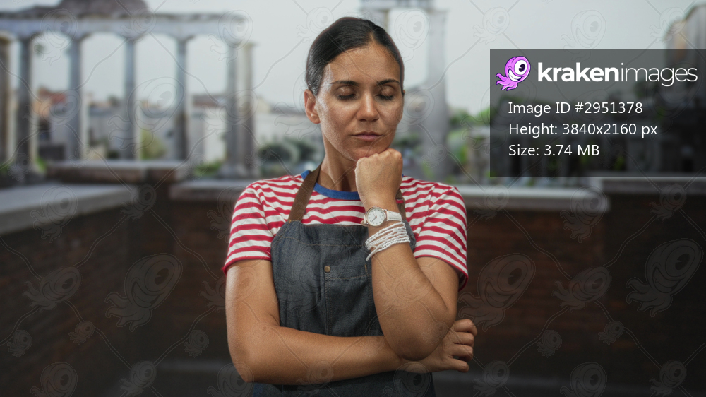 Woman in striped shirt and denim apron rests chin on fist by roman ruins building outdoors with eyes closed; contemplation.