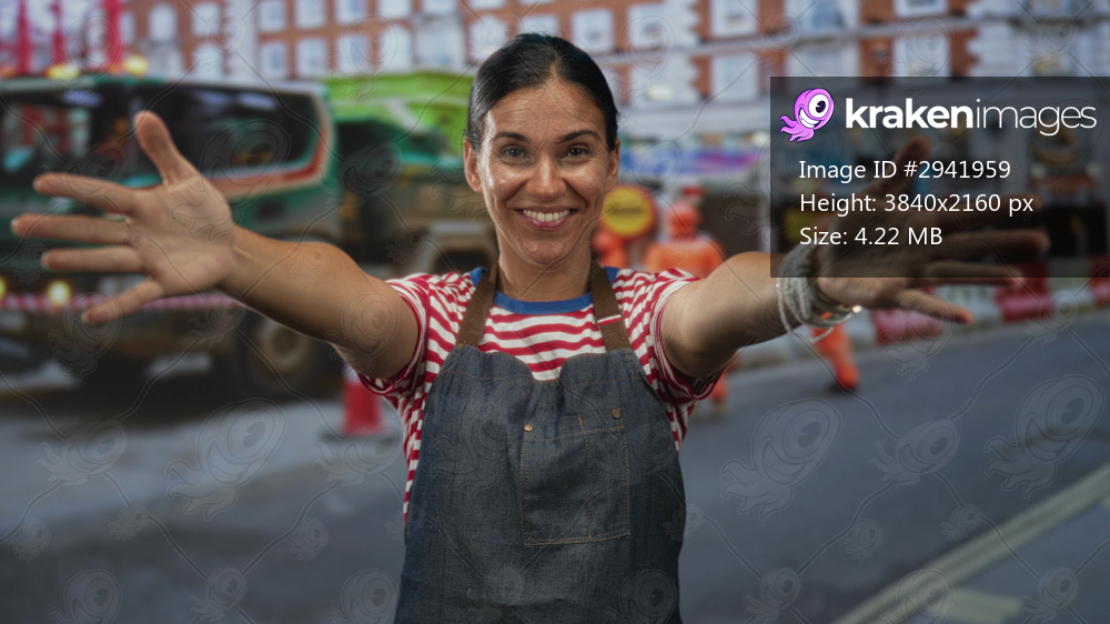 Woman in striped shirt and denim apron smiling with outstretched hands and crossed arms near a street construction site with workers and barriers visible; community warmth joy. - Kraken Images