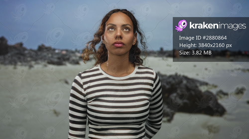 Woman in striped shirt, face turned to the side and gazing into the distance on a studio set resembling a beach; serenity reflection.