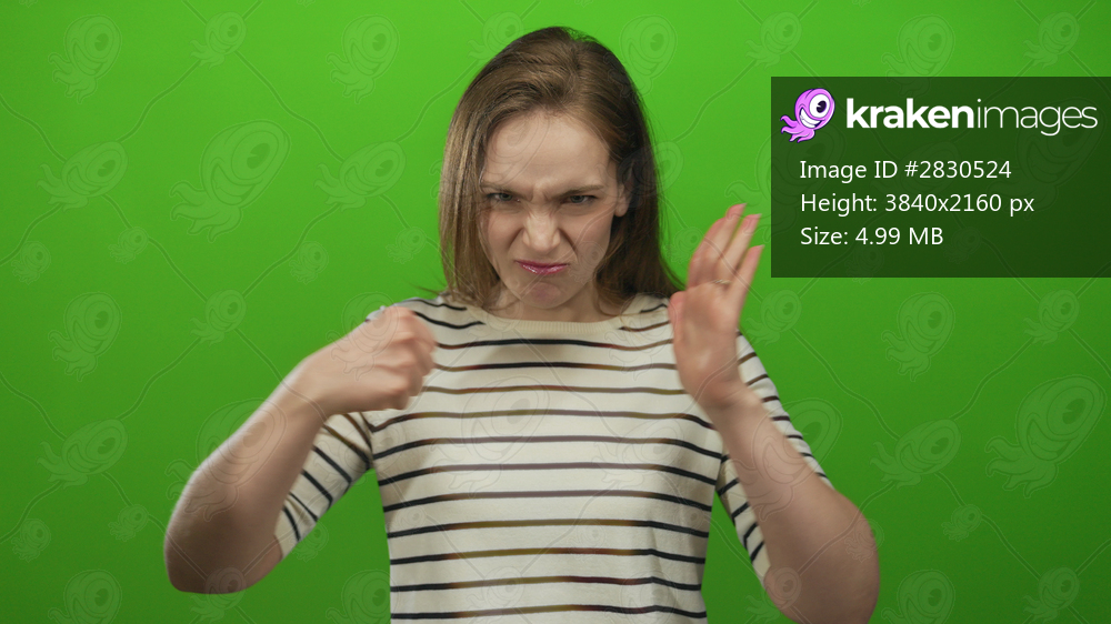 Woman in striped shirt grips fist against her chest with furrowed brow and bares gritted teeth in studio; anger.