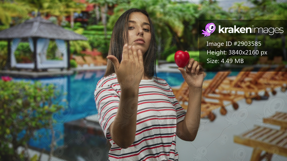 Woman in striped shirt holding a small red heart in her hand and extending the other hand forward toward camera at a building poolside gazebo and lounge chairs; longing. - Kraken Images
