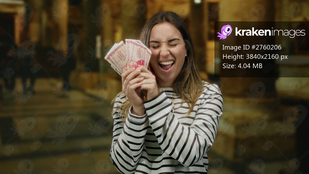 Woman in striped shirt holding indian banknotes inside church smiling joyfully with pillars in background showcasing cultural and monetary theme in indoor setting - Kraken Images