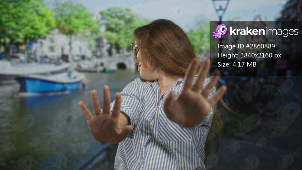 Woman in striped shirt holds both hands up blocking view of canal boat under trees; refusal personal boundary.