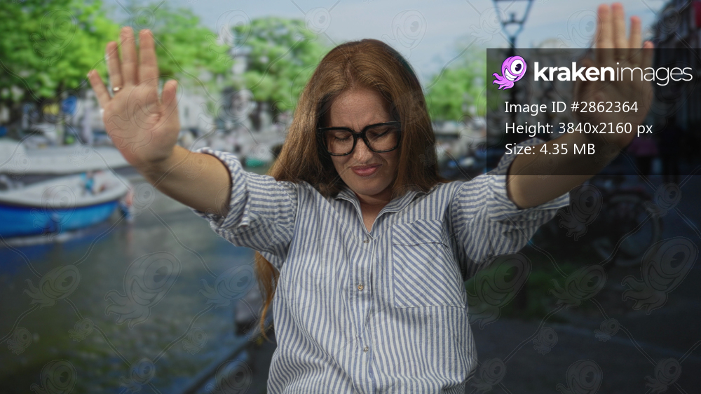 Woman in striped shirt holds both hands up blocking view of canal boat under trees; refusal personal boundary.