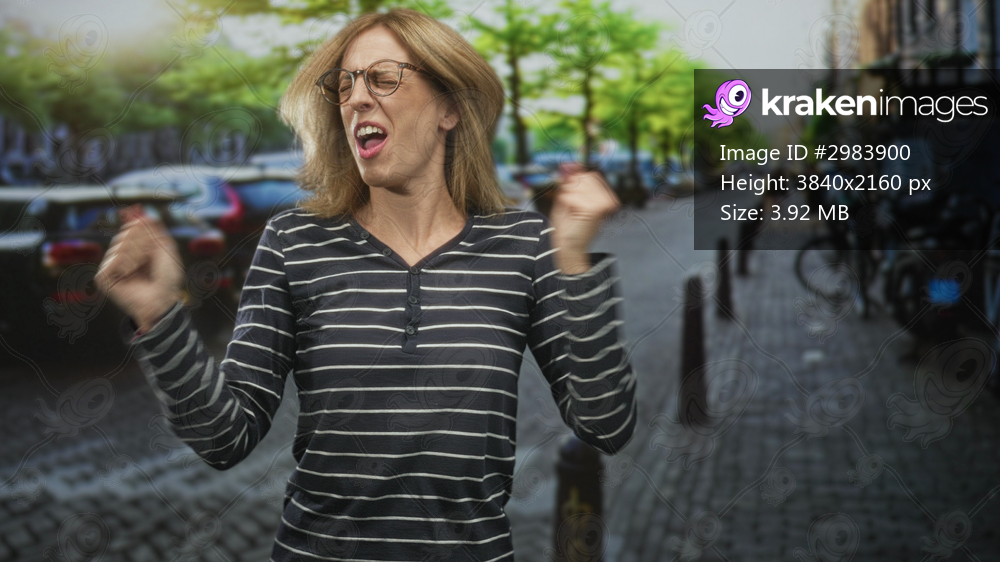 Woman in striped shirt holds hands to head, hair covering face and mouth open, wearing glasses on a cobblestone street; joy celebration release.
