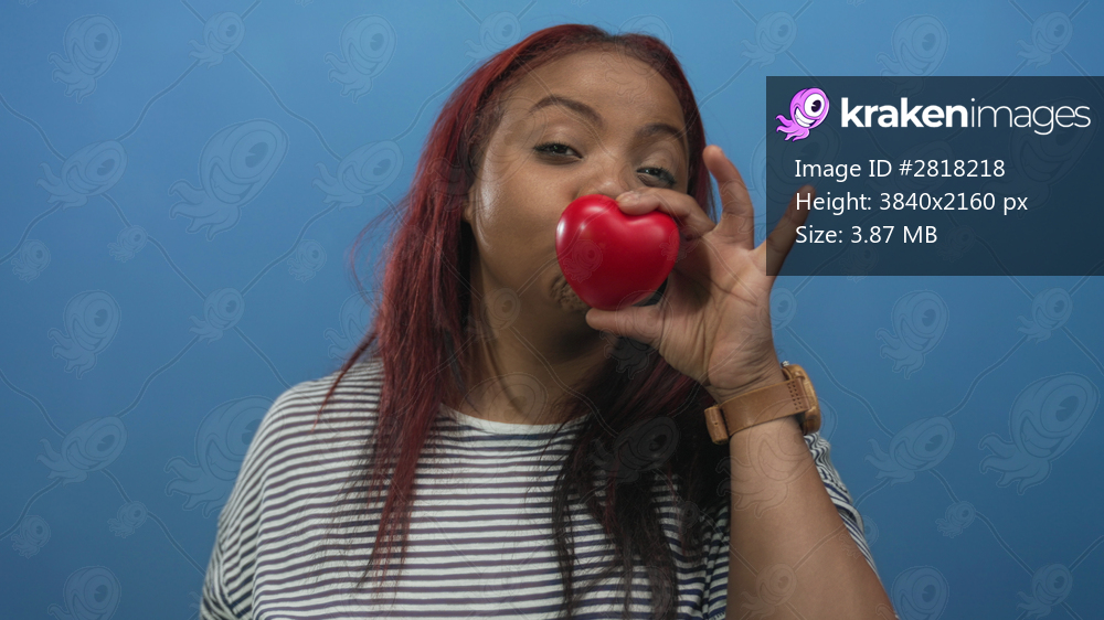 Woman in striped shirt holds red heart to eye in front of bright blue studio wall with playful grin; affection.