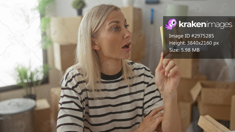 Woman in striped shirt holds yellow highlighter near nose while seated among cardboard moving boxes and plants in building; contemplative planning.