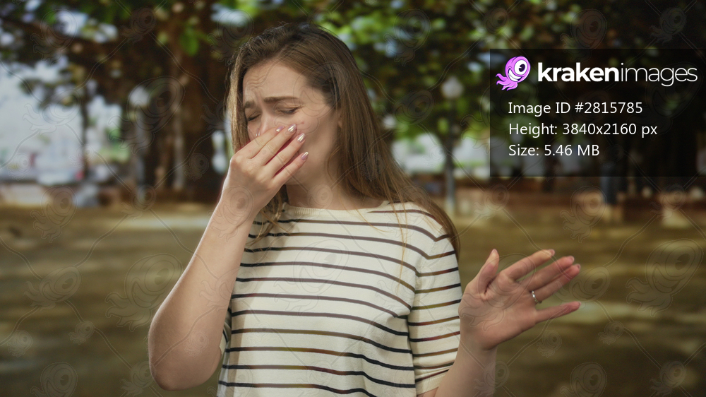 Woman in striped shirt pinches nose and lifts free hand in forest on a summer afternoon under dappled sunlight; disgust.