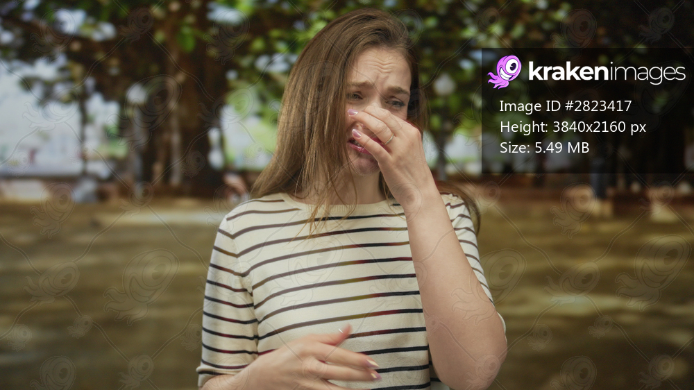Woman in striped shirt pinches nose and lifts free hand in forest on a summer afternoon under dappled sunlight; disgust.