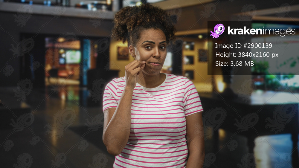 Woman in striped shirt pinching her cheek while holding an open palm gesture inside a hotel building lobby, curly hair pulled up, casual standing pose; thoughtful contemplation. - Kraken Images