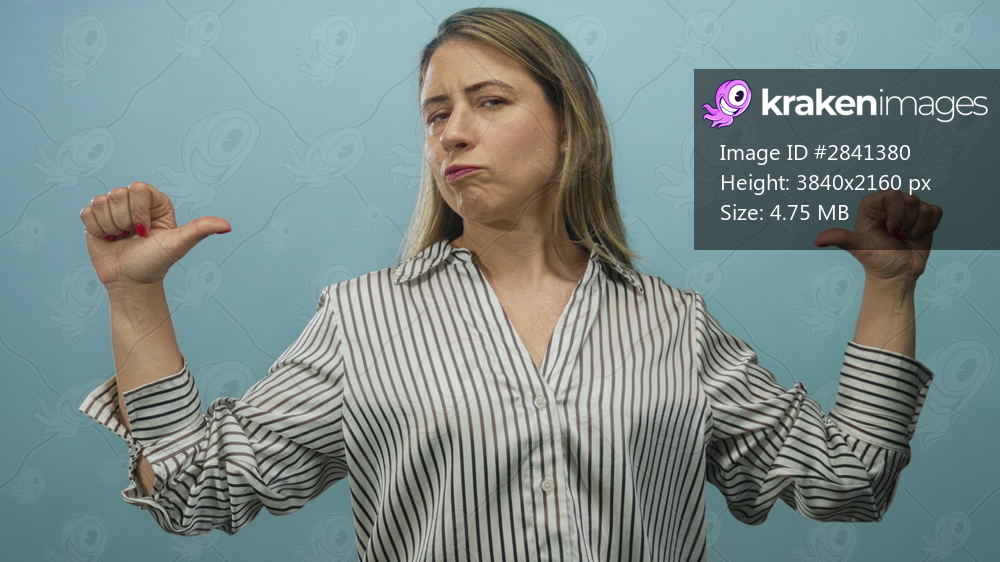 Woman in striped shirt pointing thumbs to chest in blue studio with closed eyes; pride empowerment.