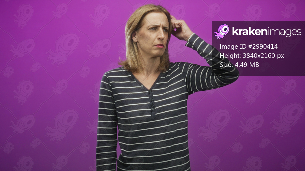 Woman in striped shirt points finger upward in a purple studio, frowning and later touching temple while looking puzzled; confusion doubt.