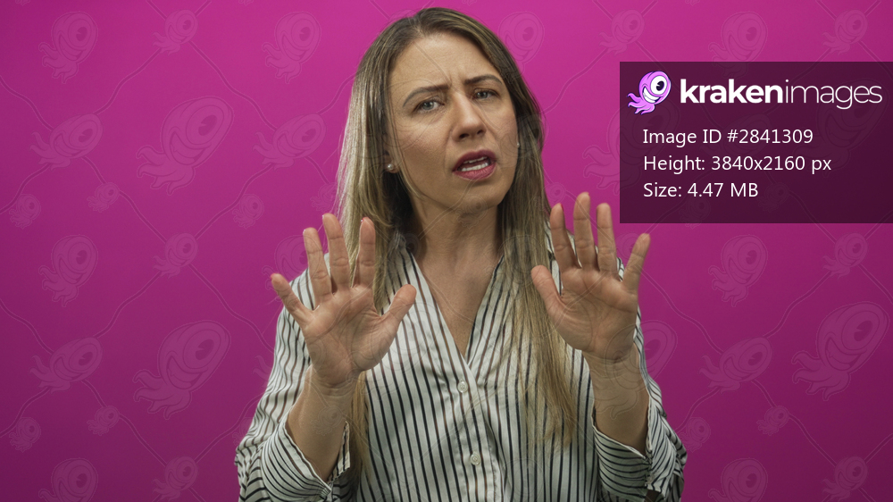Woman in striped shirt raises bare hands against pink wall in studio for calm gesture; calm patience.