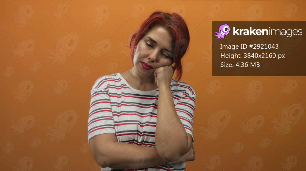 Woman in striped shirt resting head on fist touching cheek for toothache in studio with orange background; tiredness.