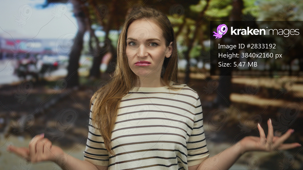 Woman in striped shirt shrugs hands and wrinkles nose in green park beside oak trees under bright sunlight; confusion.
