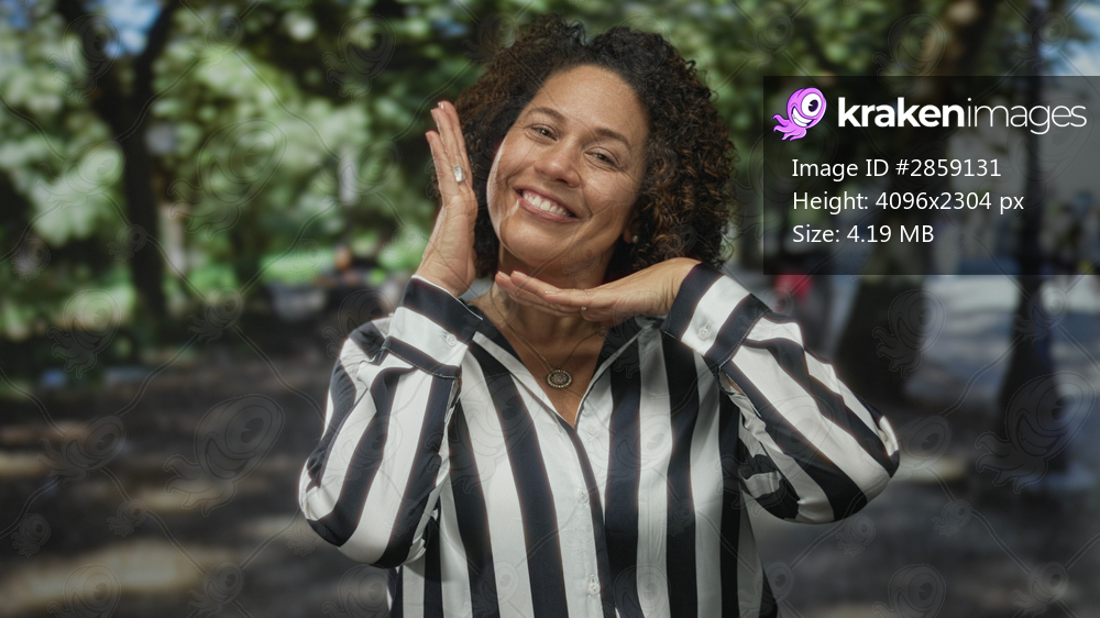 Woman in striped shirt smiles and frames face with hands under curly hair on street; playful confidence.