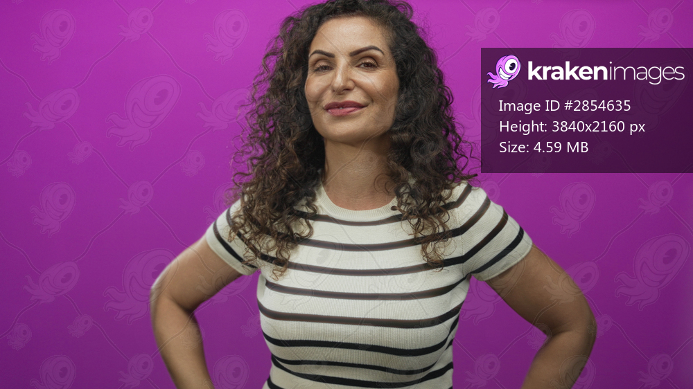Woman in striped shirt stands with hands on hips in studio and curly hair framing her face; confidence.