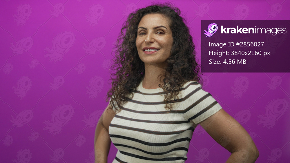 Woman in striped shirt stands with hands on hips in studio and curly hair framing her face; confidence.