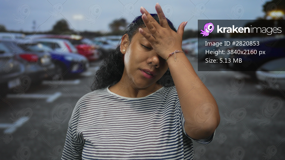 Woman in striped shirt stands leaning slightly in parking lot next to car on deserted street; contemplation.