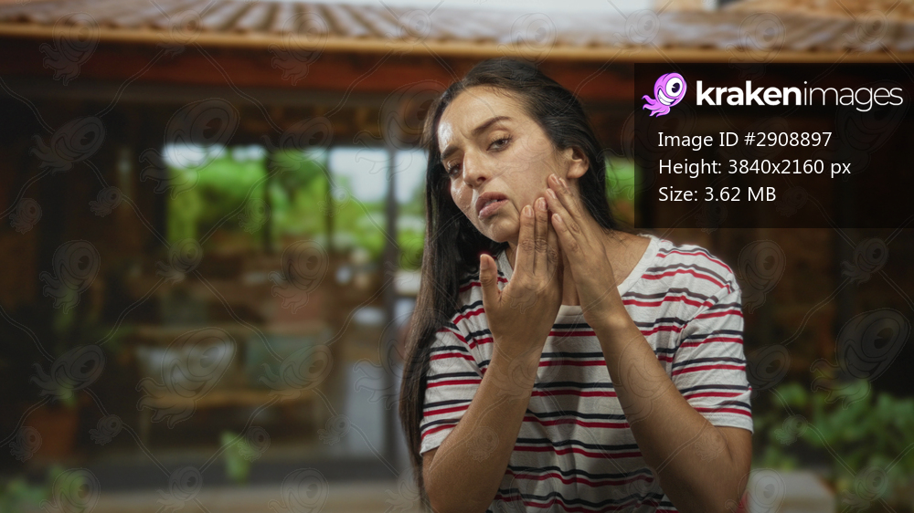 Woman in striped shirt touching face and hair with hand on cheek at building entrance checking skin texture and acne scars; self care concern.