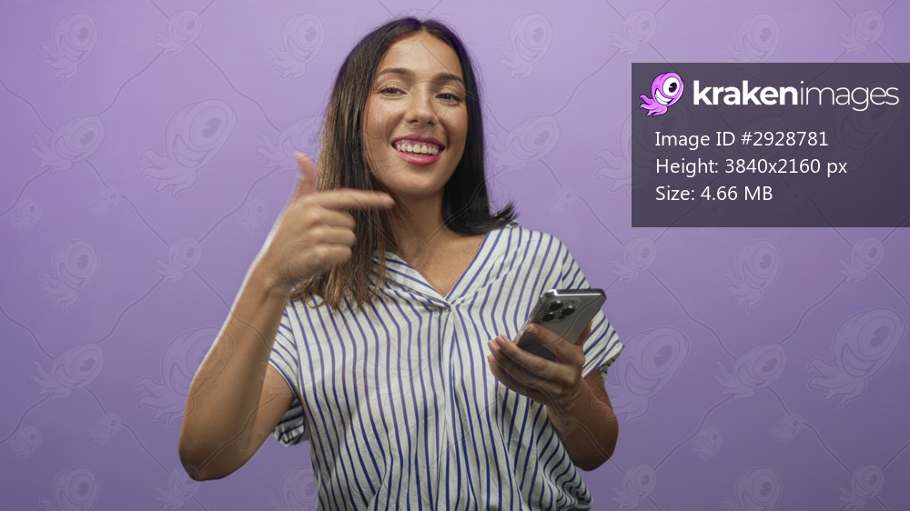 Woman in striped shirt touching smartphone screen with hands and pointing at phone in studio; happy casual communication.